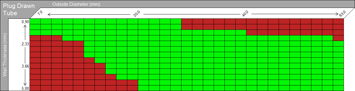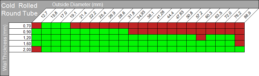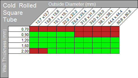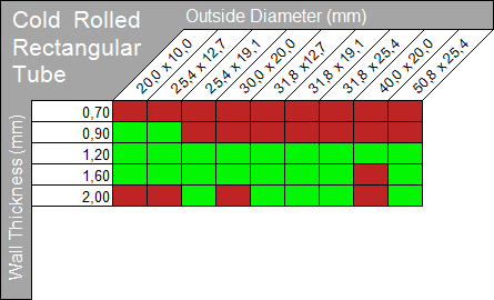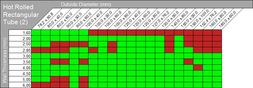 The green fields in the tables indicate the popular sizes of steel tubes that Reliant Pipes manufactures. The tables are not an indication of our technical limits so please enquire with our sales staff should your desired size not be listed or not fall on a green field.